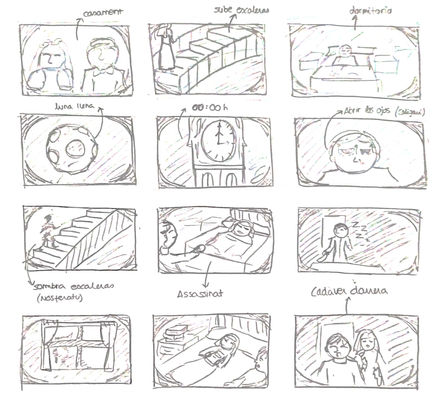 PLUJA D'IDEES: El tema inicial que ens van donar per elaborar el curtmetratge va ser "l'expressionisme alemany". A partir d'aquí, vam decidir agafar com a inspiració la novel·la "Der Zeh" d'Isaac Lúria ("La núvia cadàver" de Tim Burton també està inspirada en la mateixa novel·la). Hem agafat inspiració i elements de pel·lícules com "Nosferatu" (moviment, simbolisme, esdeveniments i format) i "El gabinet del Dr. Caligari" (espais, llum, caracterització i moviment grupal), i autors com Bram Stoker, Agatha Christie o Edgar Alan Poe. Per acabar, vam voler introduir elements romàntics com l'assassinat, els plors, la lluna, llibres, pols, criatures, la foscor, els monstres, èssers sobrenaturals i el silenci.